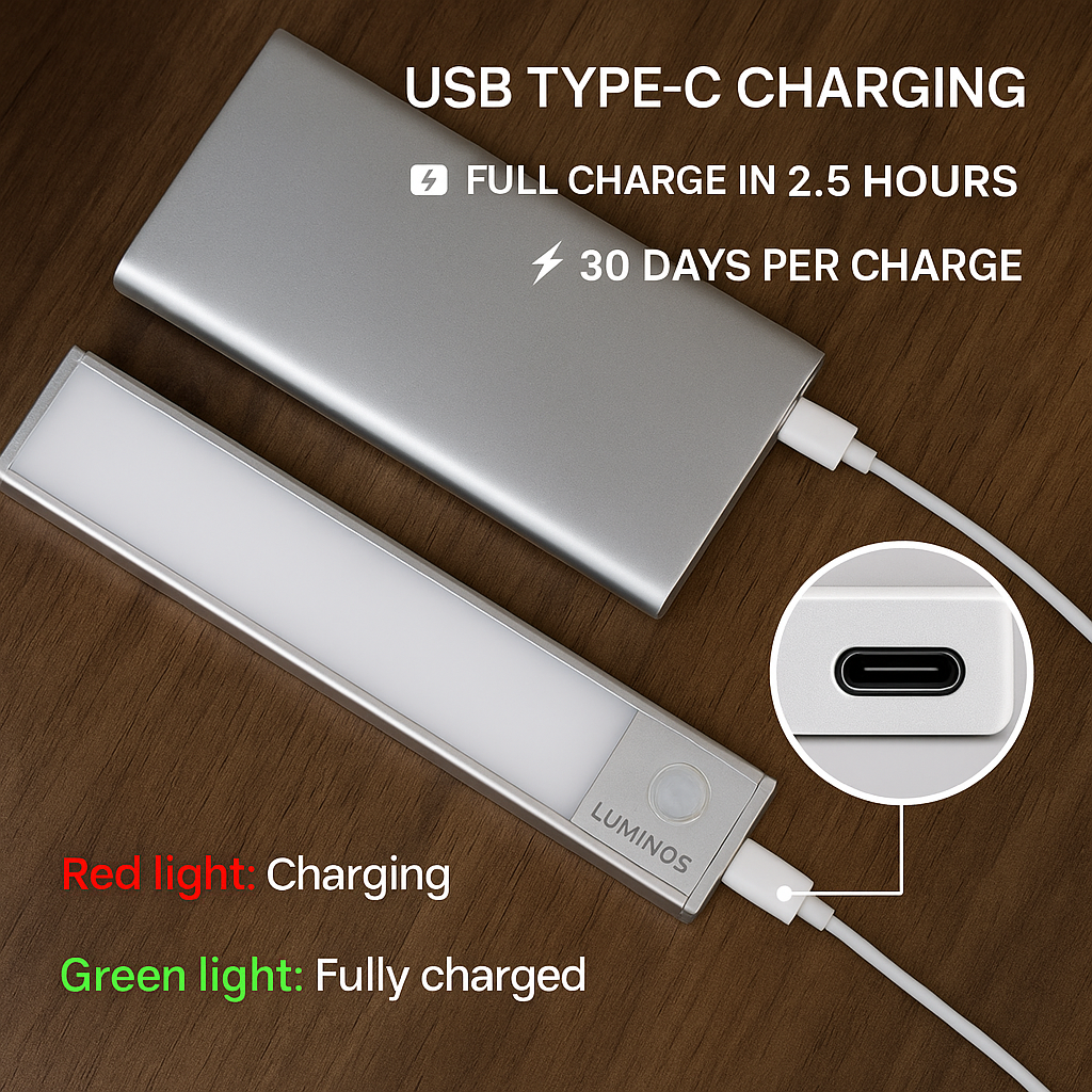 Each light bar includes a USB cable, so you can recharge it easily with any device or adapter. No more dealing with batteries: one charge gives you weeks of light.
